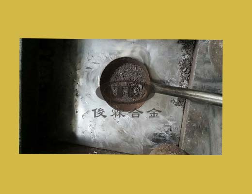 將除渣劑倒入到合金熔液渣表面,電爐控溫在450度左右,上下攪拌2分鐘,使其充分反應(yīng),用漏勺剩出合金渣(呈灰黑色粉沫顆粒)即可.